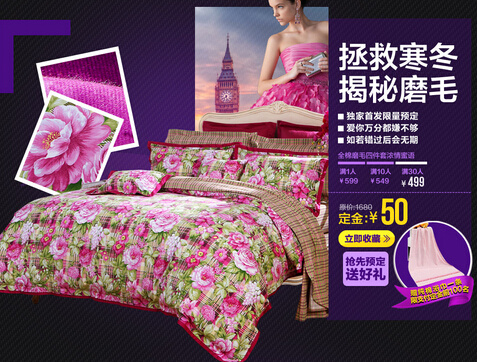 1、精選6款預(yù)售,新品超值嘗鮮價,提前預(yù)定還有好禮相送,三款絕色花型,雙層加厚毛毯和保護(hù)墊任你訂: