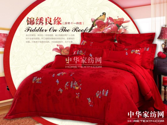 選用傳統(tǒng)的正紅色,富有寓意的玫瑰、蕾絲、牡丹、百子、鳳冠霞帔等元素,既有西式婚慶的浪漫與時尚,也有中式婚慶床品的傳統(tǒng)文化內涵,結合現(xiàn)代的剪裁工藝,環(huán)保親膚選材,讓婚嫁蘊滿吉祥,喜慶的幸福禧彩。