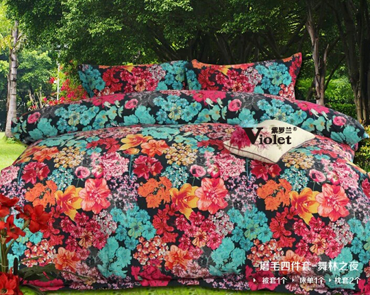 這款舞林之夜,A版以藍色作為主色調(diào),沉靜中搭配五顏六色的花朵,爭妍斗艷,畫面感極強,頓時增添了無限的生機活力。交錯的效果,營造出花園般溫馨而浪漫的家居環(huán)境,給人以時尚華麗而又陽光溫暖的感覺。而B版,藍色磨毛床單,與被套相呼應(yīng),給人以舒適干凈的視覺享受。