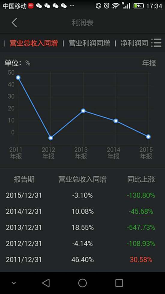 事實(shí)上,夢(mèng)潔家紡如此大規(guī)模動(dòng)作進(jìn)行轉(zhuǎn)型的背后,是其近年來經(jīng)營業(yè)績的不斷下滑。億邦動(dòng)力網(wǎng)從同花順數(shù)據(jù)了解到,從2011年到2015年,夢(mèng)潔家紡營業(yè)收入同比增速和凈利潤同比增速不斷下降(如圖2、3),其中營業(yè)收入同比增速從2011年的46.40%下降到2015年的-3.10%。