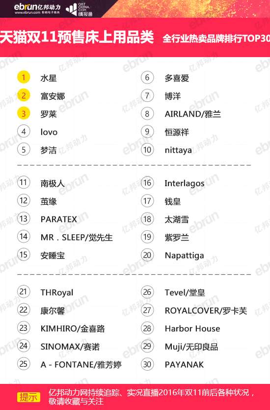 2.天貓雙11預(yù)售床上用品類全行業(yè)熱賣(mài)品牌排名TOP30