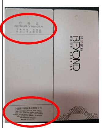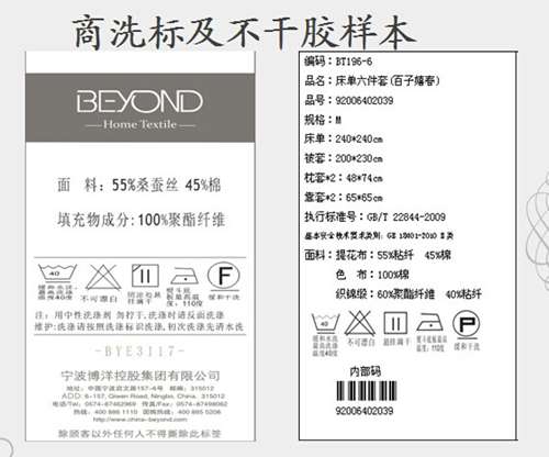 3、商洗標(biāo)與不干膠:商洗標(biāo)上標(biāo)注產(chǎn)品洗滌方式,同時(shí)編號(hào)能區(qū)分不同產(chǎn)品,商洗標(biāo)的材質(zhì)和顏色是有區(qū)分的,產(chǎn)品的商洗標(biāo)一般是貼在產(chǎn)品的被套和枕套的內(nèi)側(cè)居中位置;不干膠可區(qū)分產(chǎn)品,具體內(nèi)容包括:編碼、品名、品號(hào)、規(guī)格、床單、被套、枕套、執(zhí)行標(biāo)準(zhǔn)號(hào)、基本安全技術(shù)要求類別、面料成分、洗滌方式、內(nèi)部碼。