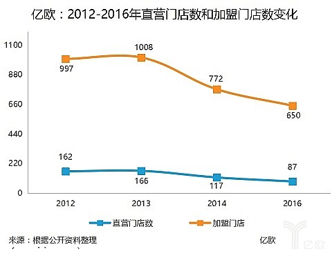 結(jié)合所有信息來看(2015年門店信息缺失),多喜愛的門店數(shù)量在不斷減少。2012年至2014年,退出加盟商數(shù)量分別為57、145和198家。2014和2015兩年間,直營門店數(shù)同時出現(xiàn)了大幅度減少,到2016年僅剩87家,接近2012年時的一半。
