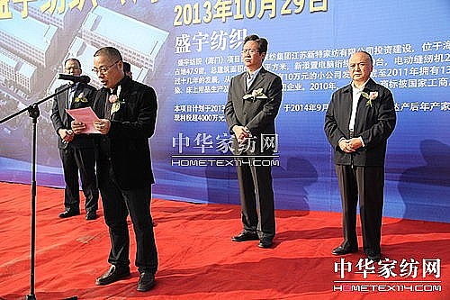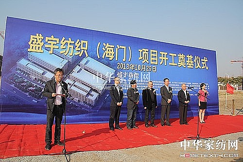 10月29日上午8點58分,盛宇家紡集團江蘇新特家紡有限公司工程奠基儀式在江蘇海門舉行。江蘇海門市市長楊曹明,市委副書記、市委常委陸一飛在工程奠基儀式上講了話。海門市相關(guān)部門領(lǐng)導也參加了工程開工奠基儀式。盛宇集團黨委書記、副總裁、盛宇家紡集團江蘇新特家紡有限公司總經(jīng)理曾上潮遠赴江蘇海門,出席了工程開工典禮儀式并講了話。盛宇家紡集團江蘇新特家紡有限公司建設(shè)項目,位于江蘇省海門市工業(yè)園區(qū)紡都大道南側(cè),占地面積47.9畝,總投資2億元,計劃2013年10月開工建設(shè),2014年9月竣工投產(chǎn),投產(chǎn)后預計年可生產(chǎn)家用紡織品200萬套套件,預計年銷售收入超5億元,可實現(xiàn)利稅4000萬元。