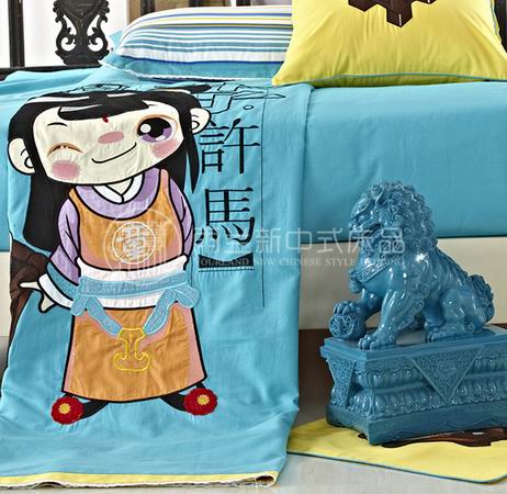 雨蘭新中式床品國學(xué)系列“百家姓”,以淺藍(lán)為主色調(diào),床單三/四件套的組合方式,全棉印花面料,使用獨(dú)特的貼布繡手法在被面繡上可愛的孩童與書桶。當(dāng)然,少不了我們的主題“百家姓”,被面三周拼黃色鏡框邊,被底為彩色條紋,橙、紅、黃、藍(lán)、紫,整體的色彩搭配鮮艷但又透著清新,吸引孩童的眼球,激發(fā)他們的求知欲。