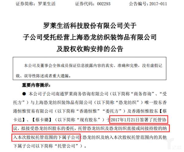- 資訊2017年1月23日晚間,羅萊生活發(fā)布公告稱,宣布以股權(quán)托管及未來并購的形式與老牌知名家紡企業(yè)上?铸埣徔椦b飾品有限公司開展全面合作。不難看出,羅萊生活正在其優(yōu)勢(shì)領(lǐng)域和戰(zhàn)略領(lǐng)域做新布局。據(jù)了解,上?铸埣徔椦b飾品有限公司成立于2005年,由蔡卡璐、蔡卡達(dá)兄弟在上海創(chuàng)立,在一線城市的高端商業(yè)渠道有較強(qiáng)話語權(quán)的家紡品牌,門店數(shù)量近300家。同時(shí),恐龍紡織作為Es...