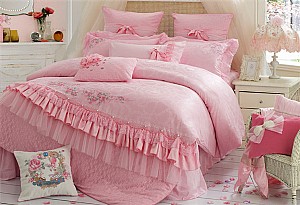 真愛一生--浪漫的粉紫色面料,以象征浪漫、溫馨的玫瑰花搭配精致優(yōu)雅的蕾絲紋樣,象征愛情潔白無瑕,粉紫色的剔透純凈加上精致優(yōu)雅的設(shè)計,為新娘的喜慶婚禮倍添浪漫和溫馨;被套上采用大量網(wǎng)紗工藝,猶如新娘婚紗般浪漫。被墊上絲帶做成的蝴蝶結(jié)更為整套產(chǎn)品增添了浪漫氣氛。